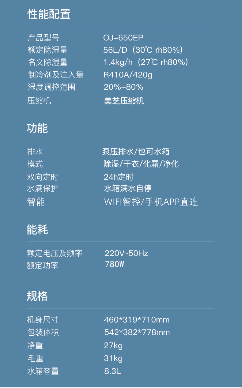 商品名称: 欧井 OJ-650EP 家用地下室大功率除湿机 56L/D 780W 220V